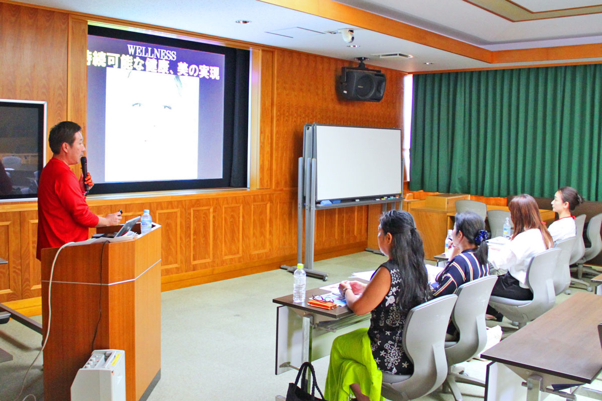 さらに沖縄セラピーの現状を知るためのタラソテラピー施設の視察では人気のSUPヨガ体験も。さらに沖縄薬草のフラッグシップ・沖縄長生薬草本社での下地社長との懇談ではオリジナルの「薬草アロマオイル」「ハーブボール」などに関する意見交換も行われ、参加者の今後の活動に大きな刺激を受けることとなった。