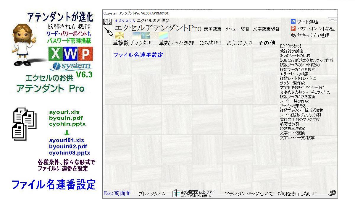 アテンダントProをV6.3バージョンアップ。ファイル名連番設定を追加。指定した各種複数ファイルのファイル名に連番を設定します。