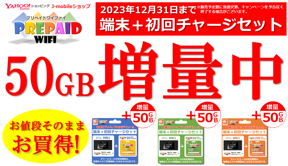 ジャパンモバイル株式会社(本社:札幌市中央区、代表取締役社長:賣場崇大、以下「J-mobile」)は、Yahoo!ショッピング『J-mobileショップ』にて絶賛販売中の『MR1端末本体+初回チャージ(30GB、50GB、100GB)セット』を、2023年10月27日から2023年12月31日まで『+50GB』チャージコースの容量を増量し、従来の販売価格そのままでご提供いたします。