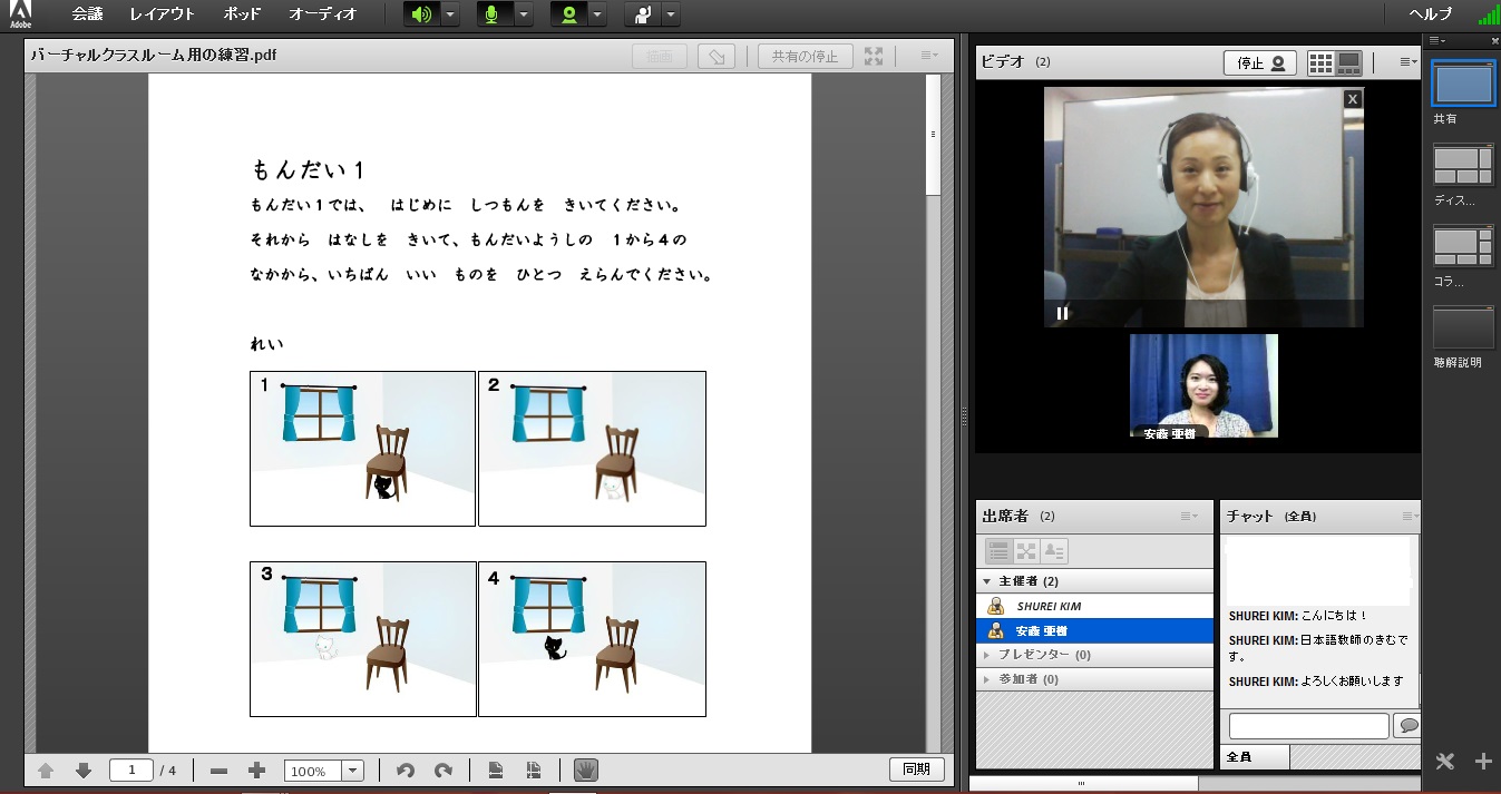 3)「日本語レッスン」とは、アテインのバーチャルクラスのことで、仮想の日本語教室です。学習者が一人で映像教材を視聴する従来のeラーニングの学習スタイルと異なり、別の場所にいる他の学習者と、同じ時間にひとつの授業を受講します。講師と学習者は双方向でつながり、会話もできます。