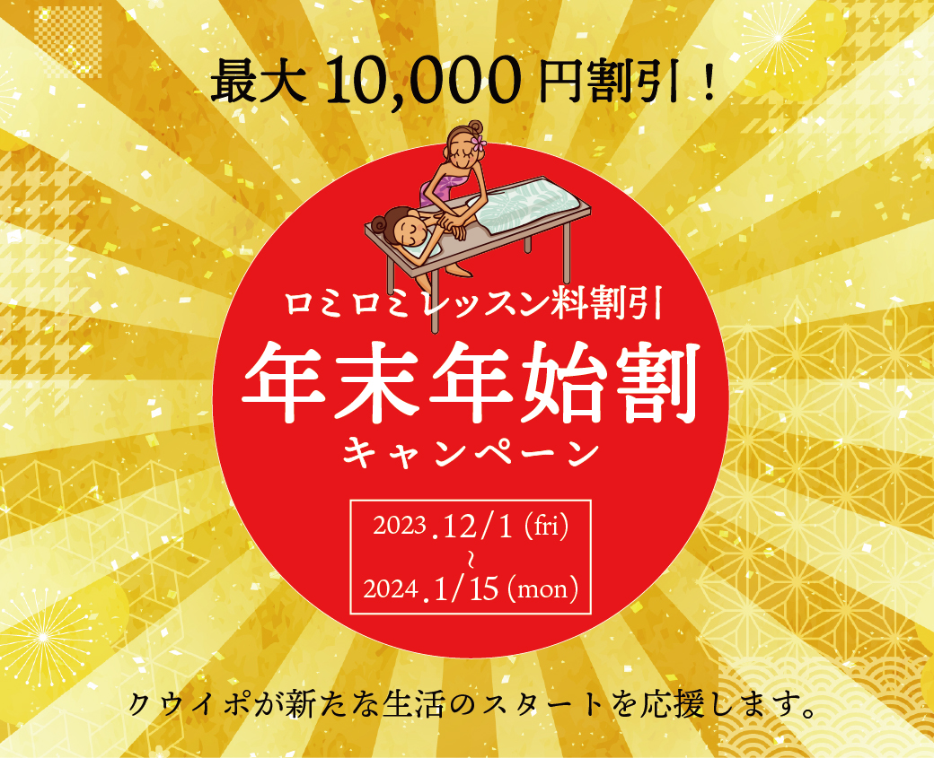 こういった収入とやりがいを得ることができるロミロミセラピストになることで新しい自分を求めている方のためにクウイポロミロミスクールではロミロミのレッスン料が最大10,000円割引になる【年末年始割引キャンペーン】を実施いたします。