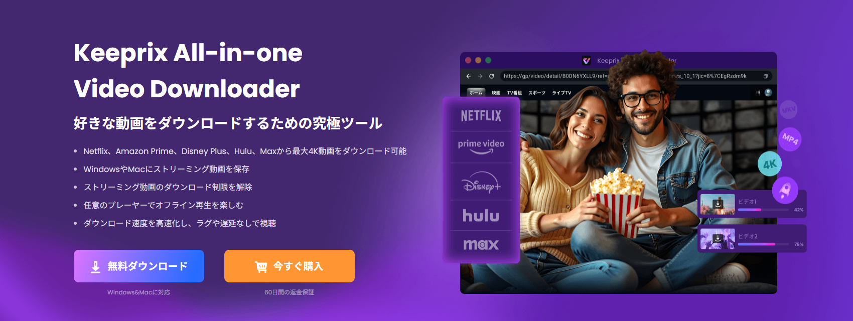Keeprix Video Downloaderは、NetflixやAmazon Prime Video、Disney+などの人気ストリーミングサービスから、動画を高画質・広告なしでダウンロードできるソフトウェアです。オフラインでも自由に映像を楽しめる新しい視聴スタイルを提供します。