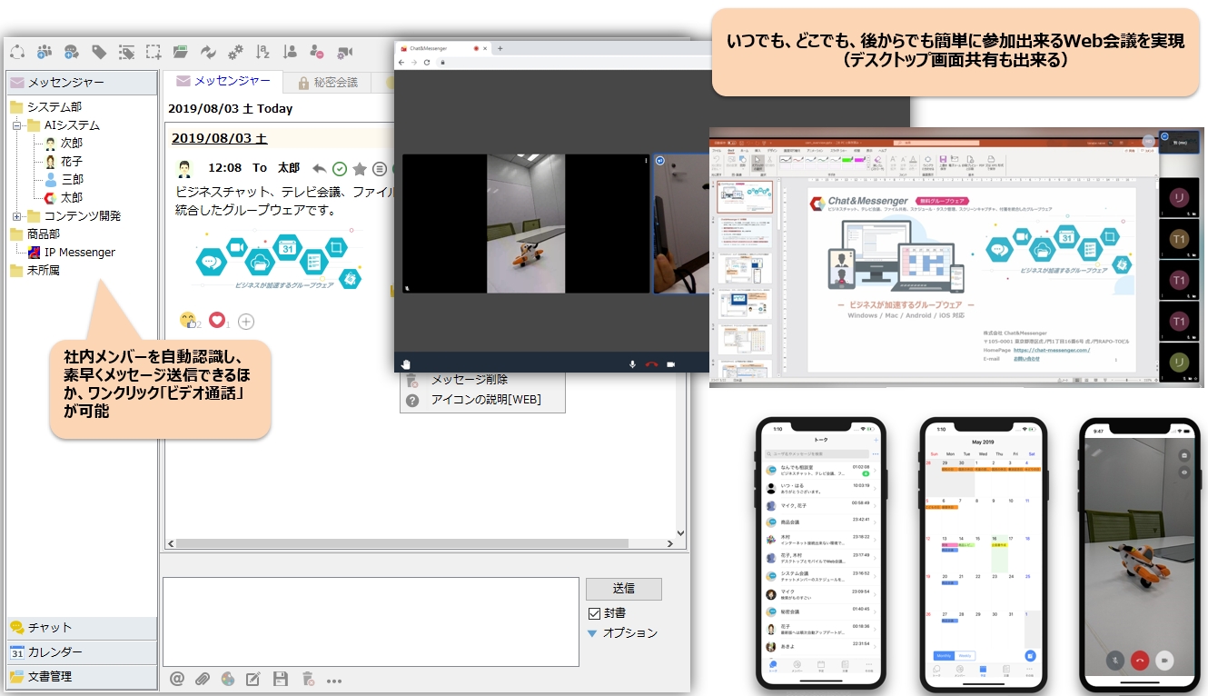 オンプレミス環境で簡単にWeb会議を! Chat&Messenger はビジネスチャット、Web会議、ファイル共有、スケジュールを統合した All-in-One ビジネスコミュニケーションツール