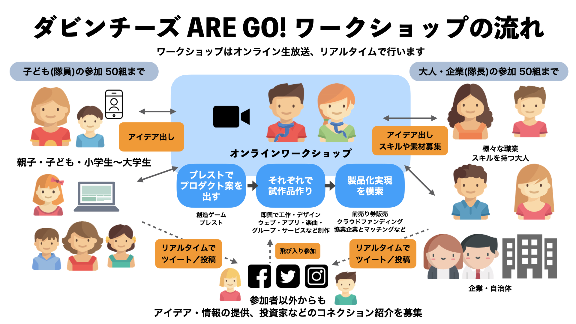 子ども、大人、企業が一定の割合で参加し、Zoomを使用して生配信で行います。創造性を高めるためのウォームアップ(ゲーム)、課題出しの後、課題を解決するためのアイデアを出し合って即座に大人からのアドバイスをもらいます。その中で取り組みたいアイデアを決め、即興の工作で試作品を制作したり、新たにアイデアを乗せていきます。ワークショップ以降、Facebookグループで役割や進捗を報告しながらプロジェクトとして進めていき、企業や団体とコラボしたり、クラウドファンディングを利用することで完成を目指します。
