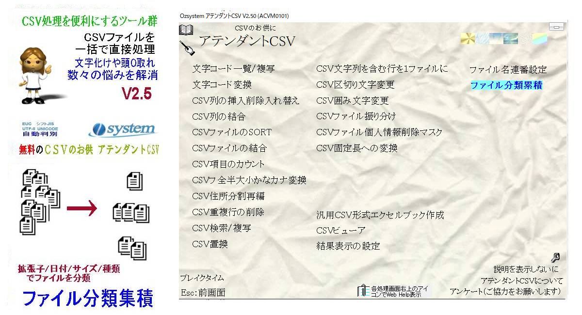 CSV処理をより便利にする無料ツール集「CSVのお供 アテンダントCSV」をバージョンアップ。処理を補完するファイル操作用ツール第2弾として「ファイル分類集積」を追加しました。