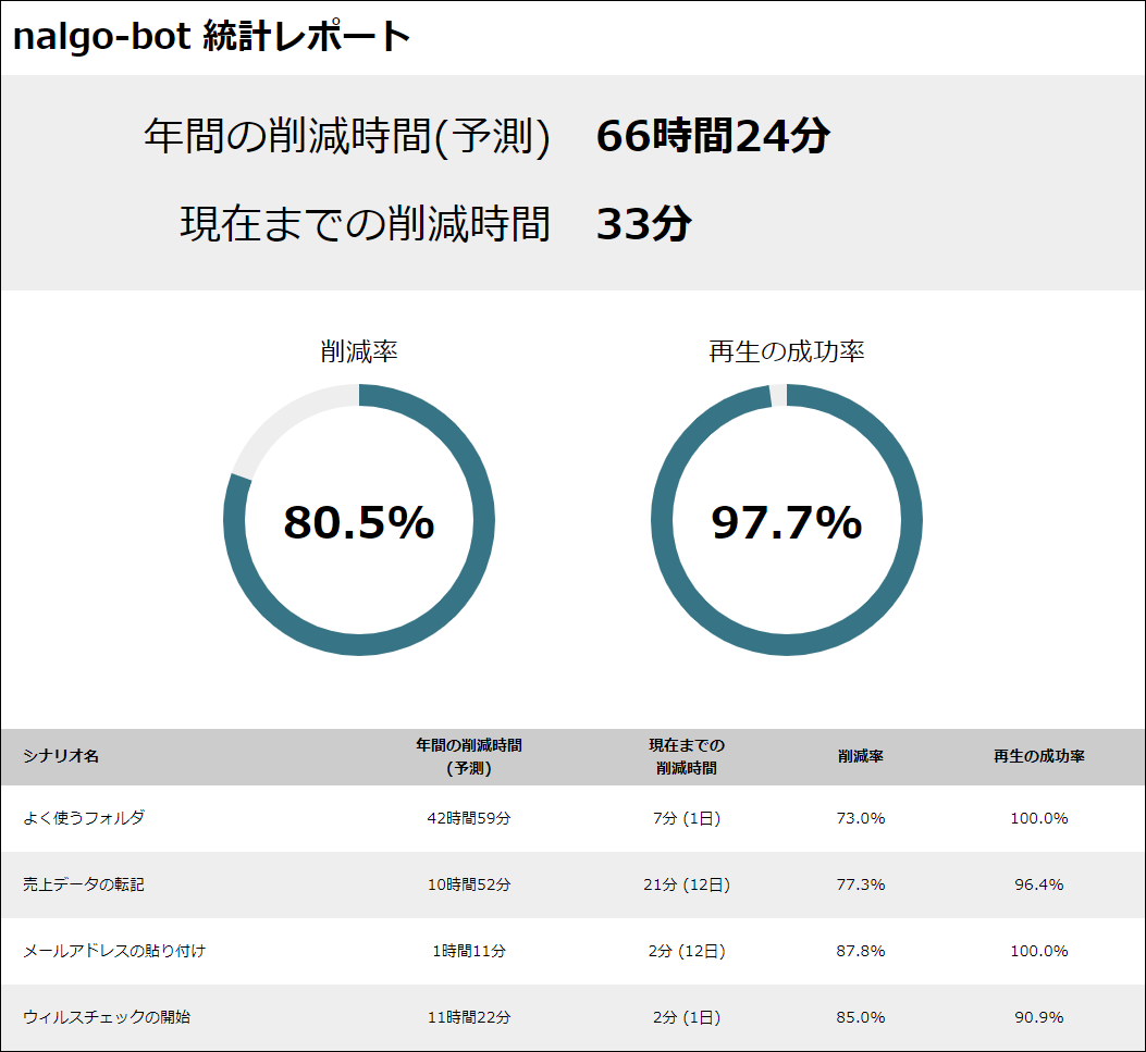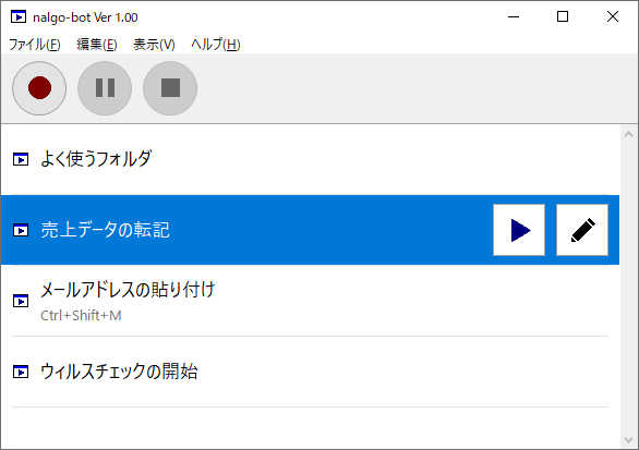 「nalgo-bot」は、 パソコンでの日常の通常作業を簡単に自動化。 作業を記録して、 再生するだけの大変簡単な手順で、 パソコン初心者の方でもご利用いただけます。 また、 スクリプト変換を行うことで複雑な自動化も可能となっています。