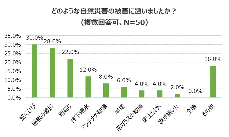 つづいて、「どのような被害に遭ったのか」たずねました。『壁にひび』(30.0%)が最多で、『屋根の破損』(28.0%)、『雨漏り』(22.0%)、『床下浸水』(12.0%)とつづきました。また、『その他』(18.0%)でも、「ベランダが吹き飛ばされた」(千葉県)、「壁クロスが雨で濡れて剥がれた」(東京都)、「ガレージが半壊」(愛知県)など、今年の台風での被害が目立ちました。