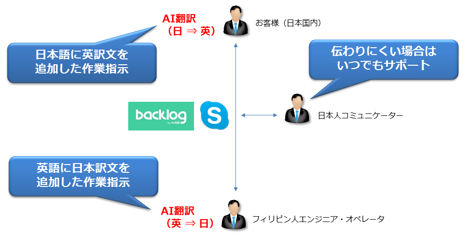 さらに「チョクオペ」では、コミュニケーションのずれなどが生じた場合、あるいは意味が通じにくい内容を伝える必要が生じた時のために、全てのコミュニケーショングループに英語が堪能な日本人コミュニケーターを配置しております。お客様とフィリピン人エンジニアとのコミュニケーションをウオッチしておりますので、必要に応じてヘルプに入り、コミュニケーションのサポートを行うことが可能です。