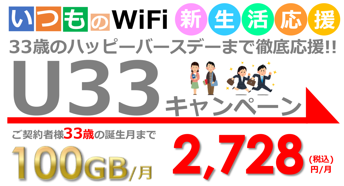 『いつものWiFi U33キャンペーン』33歳の誕生月まで月100GBが2,728円!!