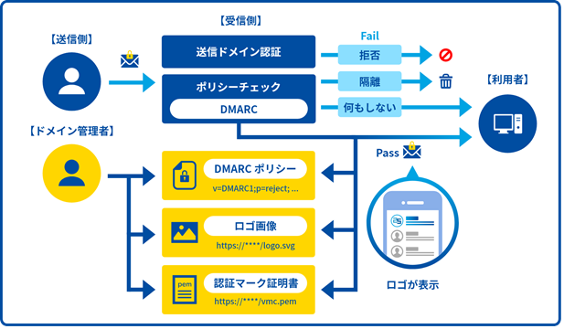DMARCは、送信ドメイン認証(SPF、DKIM)と組み合わせて使用する認証技術で、SPF/DKIM認証に失敗したメールを、受信側をどう処理するかの推奨アクションを、送信側(ドメイン管理側)がDMARCポリシーとして設定してDNSに公開することで、受信側が参照できるようにし、受信側はポリシーに従ったアクションを実行し、その結果をDMARCレポートとして送信側にフィードバックする仕組みです。