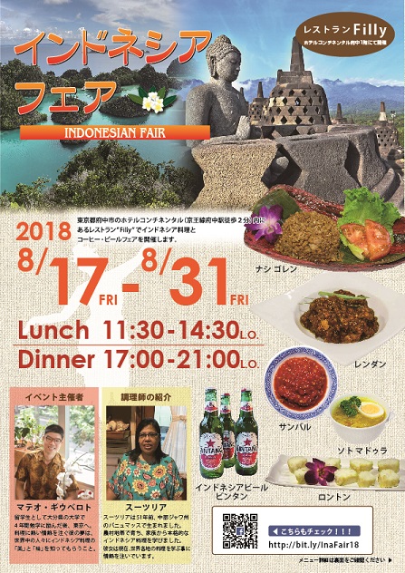 ホテルコンチネンタル府中(所在地:東京都府中市、総支配人:田村 豊)のレストラン「Filly(フィリー)」では、今年2018年が日本とインドネシアの国交樹立60周年となることを記念し、インドネシアをより身近に感じ食を通した文化交流の懸け橋となれるよう、インドネシア料理フェアをインドネシアの独立記念日である8月17日(金)より8月31日までの15日間開催いたします。