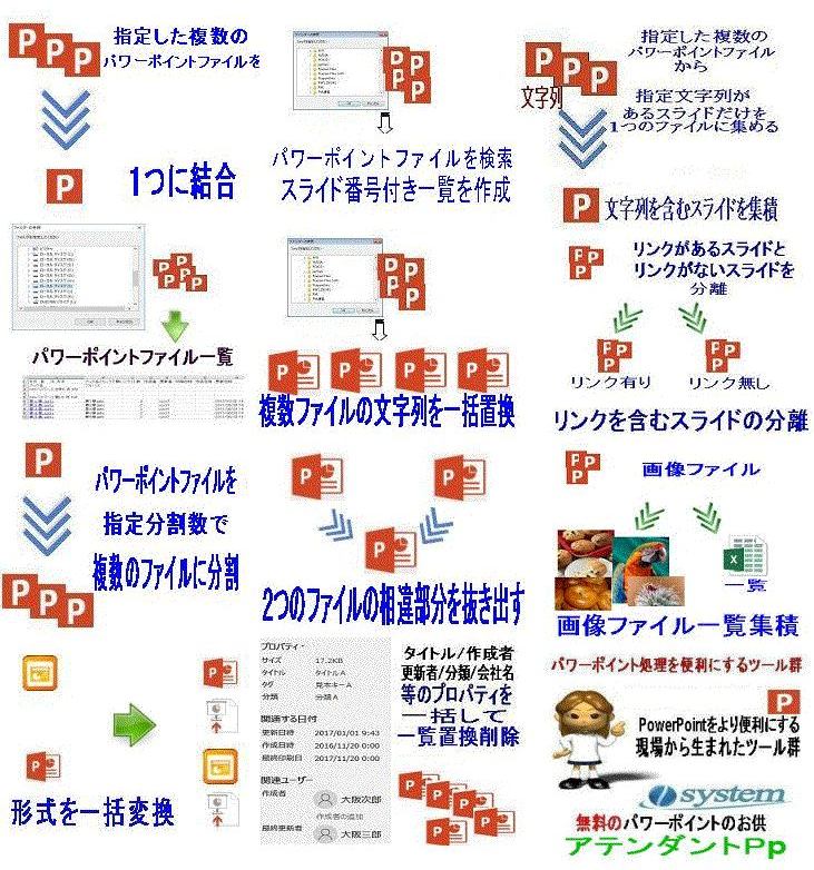 アテンダントPpは、パワーポイントの処理を便利にする無料ツール集です。