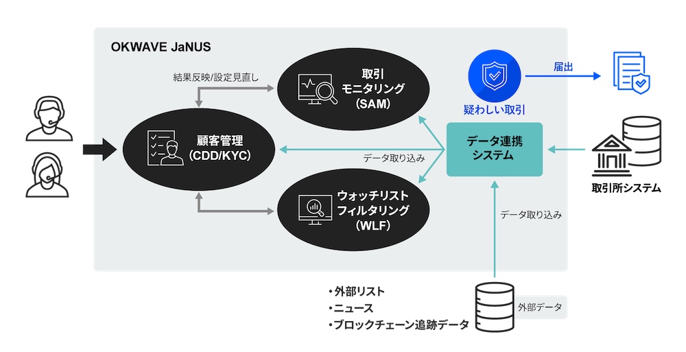 『OKWAVE JaNUS』は、信頼性の高いビッグデータ分析製品(※2)を基盤に、暗号資産業界に求められるAML対応ナレッジを集約した統合ソリューションです。