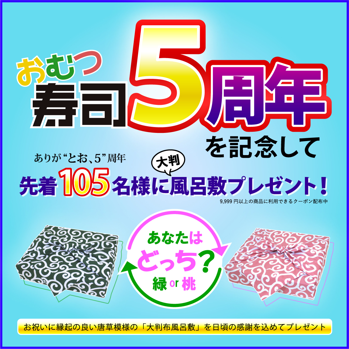 ユニーク出産祝い『おむつ寿司』の5周年を記念して、好評の大判風呂敷を無料GETできるクーポンプレゼントキャンペーン!!