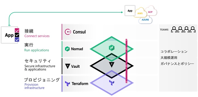 HashiCorp社の以下のツール群は、あらゆるアプリケーションやOSのマルチクラウドへのプロビジョニング、シークレット管理と保護、接続、および実行を自動化します。各ツールは単独での導入も可能です。