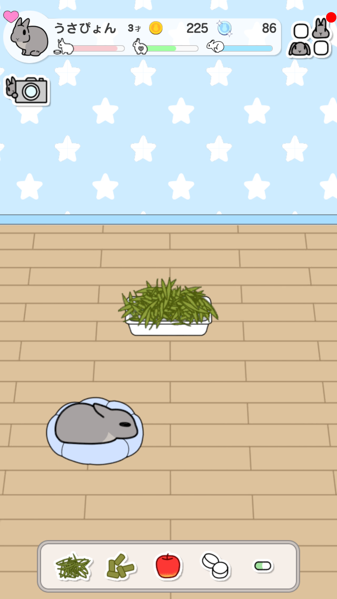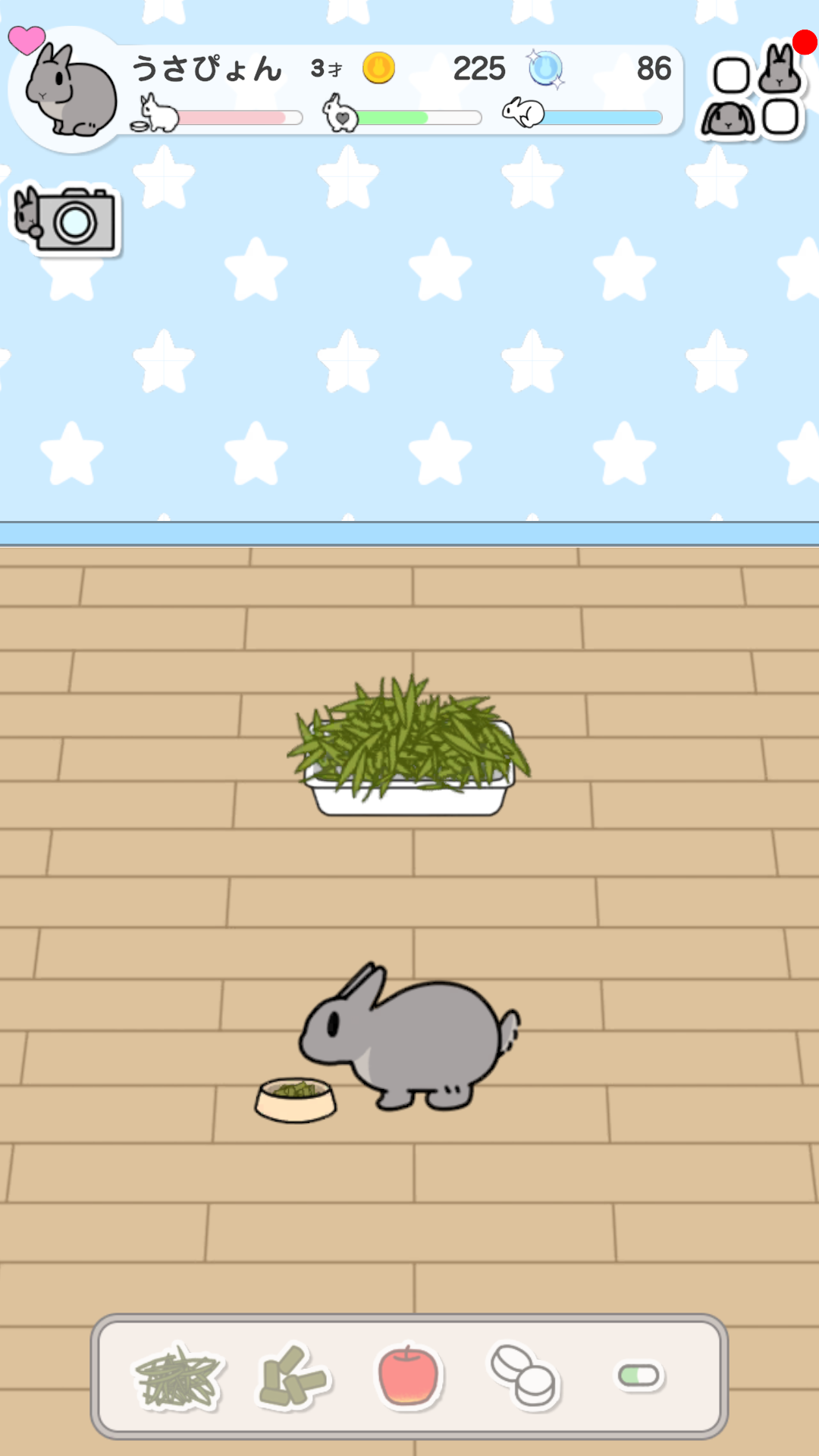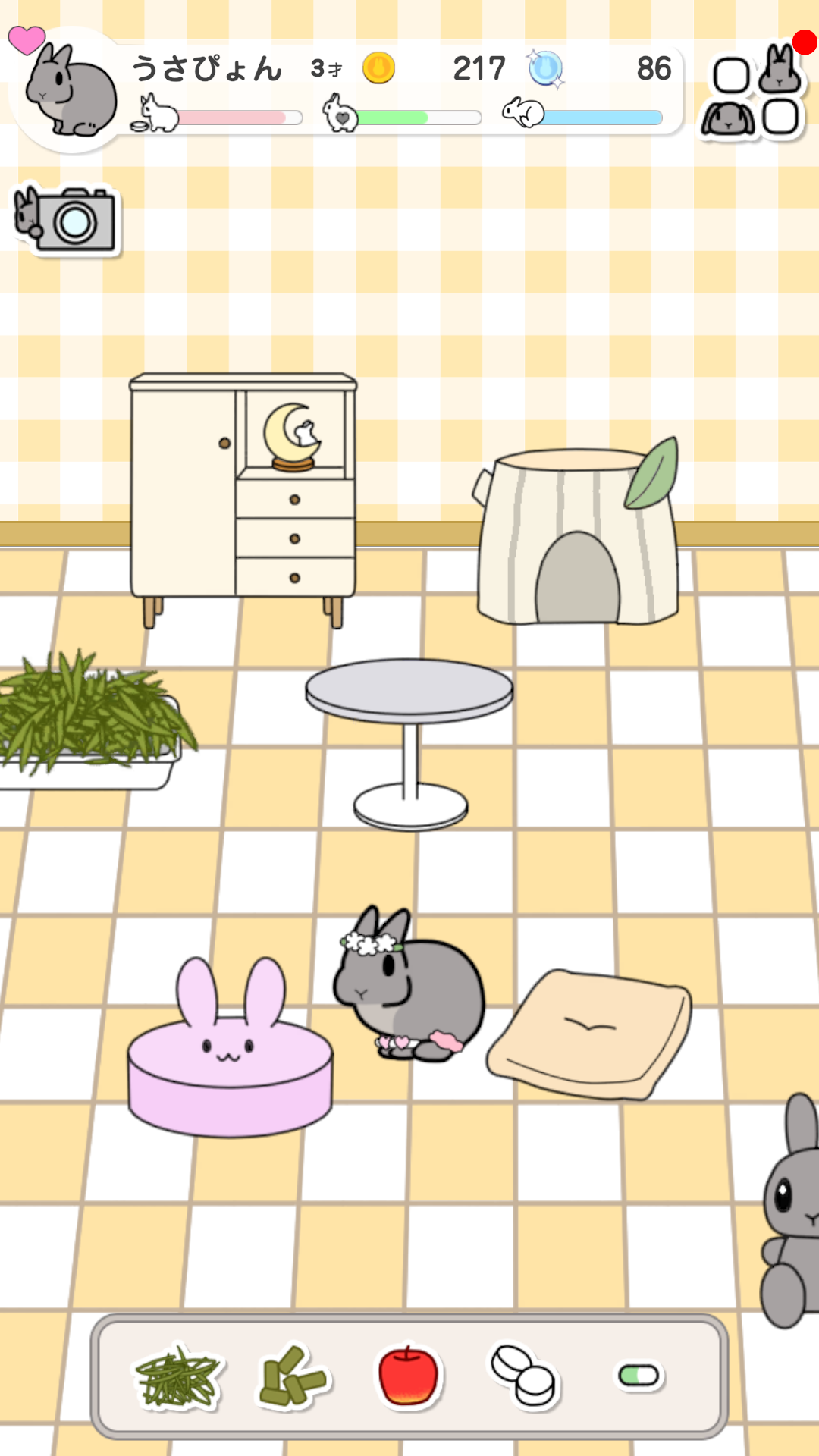 ミニゲーム「おさんぽ」などで集めたコインを利用して、お部屋に家具を配置して模様替えをしたり、うさぎさんにアクセサリーを付けたりすることができます。