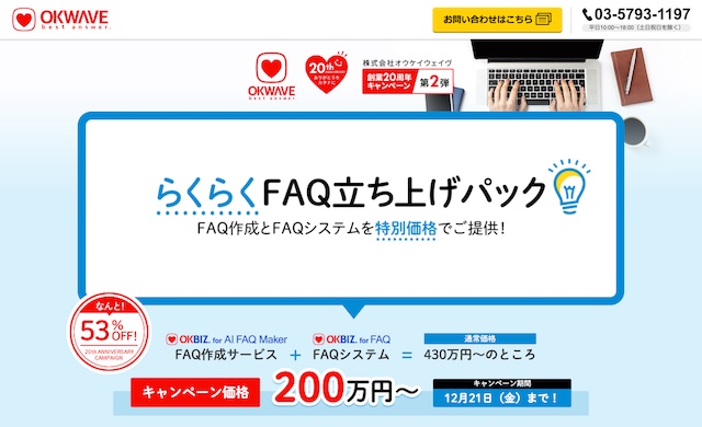 オウケイウェイヴ20周年記念キャンペーン第2弾『らくらくFAQ立ち上げパック』は、「同じようなお問い合わせを減らしたい」「顧客サポート業務をもっと効率化したい」けれども、「FAQ(よくある質問とその回答)をどう作成すればいいかわからない」「FAQを作成する時間や人手が足りない」といった悩みを抱える企業に向けて、AIによるFAQ自動作成支援ツール「OKBIZ. for AI FAQ Maker」(https://www.okwave.co.jp/business/service/okbiz-ai-faq-maker/)と、500社以上の大手企業や官公庁に導入している国内シェアNo.1のFAQシステム「OKBIZ. for FAQ」(https://www.okwave.co.jp/business/service/biz-faq-helpdesk/)をセットにして提供するキャンペーンです。