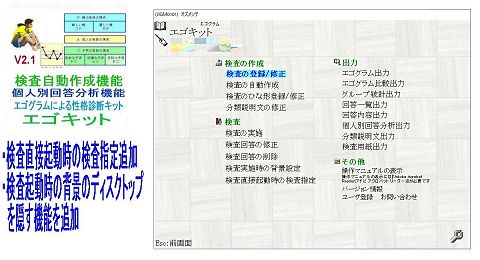エゴグラム作成キット:エゴキットをV2.10にバージョンアップ。検査直接起動時の検査指定/背景のディスクトップを隠す機能を追加