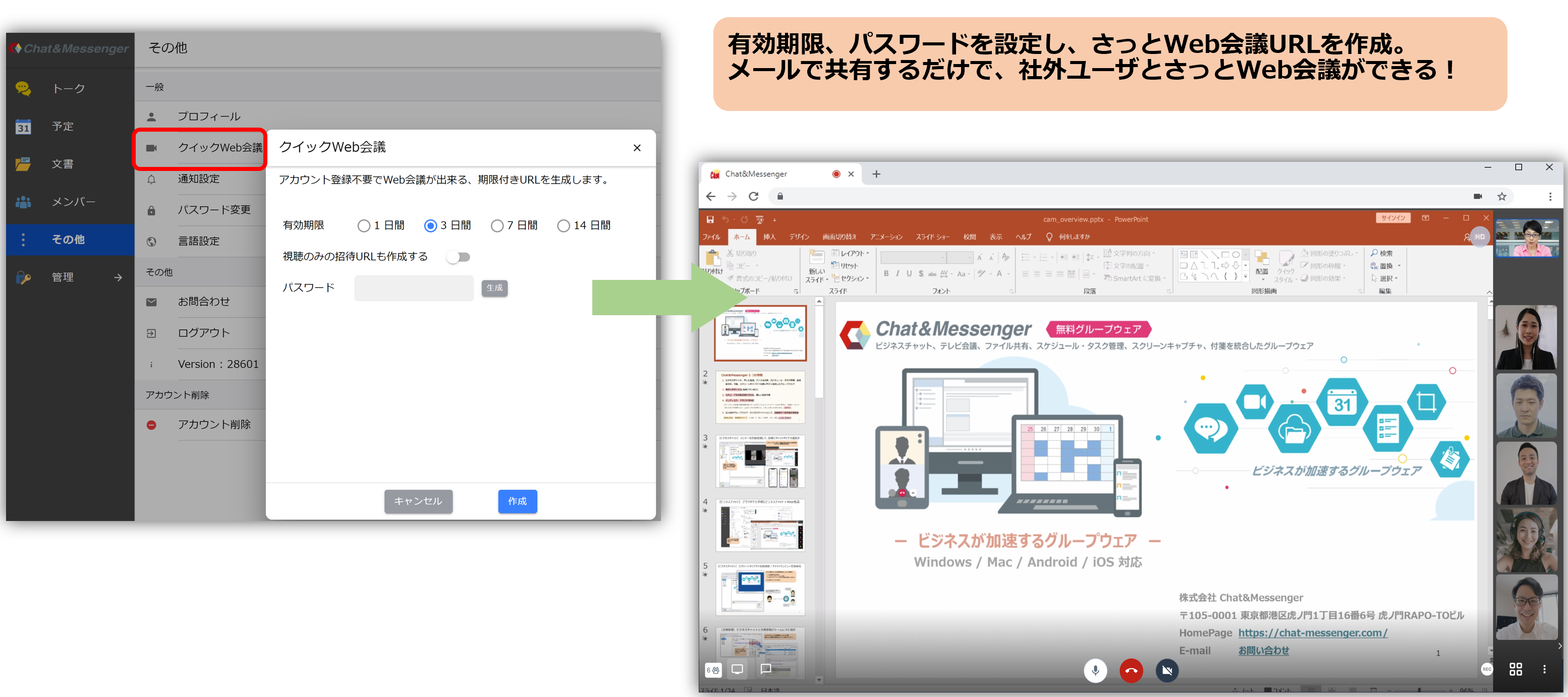Chat&Messenger はビジネスチャット、Web会議、スケジュール、文書管理などを統合した
