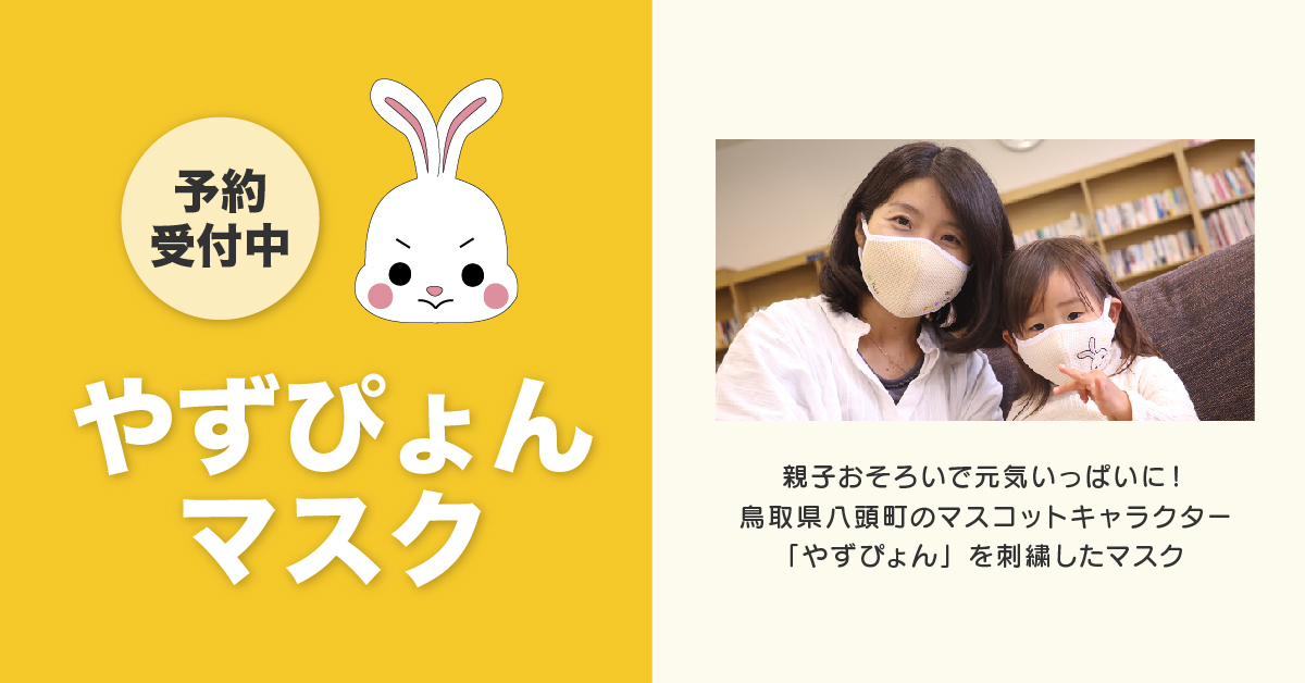 鳥取県八頭町のマスコットキャラクター「やずぴょん」を全国に広めようというテーマを掲げ、地元デザイナーさんからアイデアを募り、その想いを地元の職人たちの技術で表現したマスク。親子おそろいでも楽しめる4つのデザインを揃え、着用した方が笑顔になって欲しいという想いが込められています。
