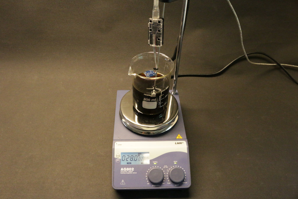 最初に、赤外線温度センサ「POC-温度IRセンサ(MLX90614ESF-DCA)搭載小型USBモジュール」の精度を検証するための小さな実験をセットアップしました。小型の実験室用スターラーを使用して、ビーカー内の液体を37°Cに加熱し、赤外線温度センサ「POC-温度IRセンサ(MLX90614ESF-DCA)搭載小型USBモジュール」を使用して5cmの距離からその温度を測定しました。表面の真下に沈められたPt100プローブは、基準値を提供します。