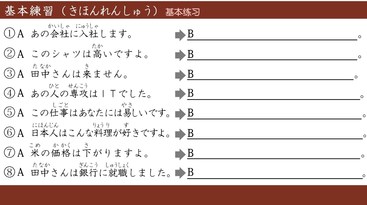 このコースは中級日本語レベルであり、学習者がすでに日本語能力試験N3レベルの日本語を理解していることを前提としておりますので、課の冒頭に「学習目的」と「導入文法」を適示して、学習すべき目標を明らかにし、学習者に学習の方向を理解していただきます。学習内容の導入は、「対話」を通して行い、就職希望者が遭遇する可能性が高い場面での会話を通して学習するので、学びやすく、学習意欲も強化されます。文法や用法の「解説」は、学習者がすでに学習している場合もあるので、簡明に記述してあります。 さらに、課ごとに➀「基本練習」、②「応用練習」、③「ロールプレイ」練習がありますが、①「基本練習」では、主として文法的規則の確認を行い、②「応用練習」では、主として、学習内容を学習者自身の状況に合わせて、語らせる実践的な練習を行います。③「ロールプレイ」は、学習している表現を使用する練習ですから、実践的な言語使用能力を育成する最も大切な練習といえます。「ビジネス情報」は、課の主題に関連した日本の「ビジネス情報」や「ビジネス慣習」を解説していますので、日本企業へ就職した際に役立つものと思われます。