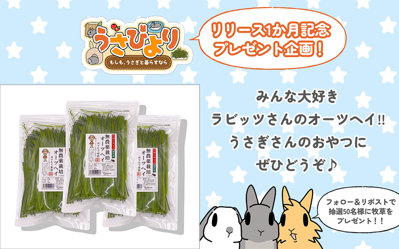 【うさびより】リリース1ヶ月記念!無農薬オーツヘイが当たる抽選キャンペーン開催のお知らせ