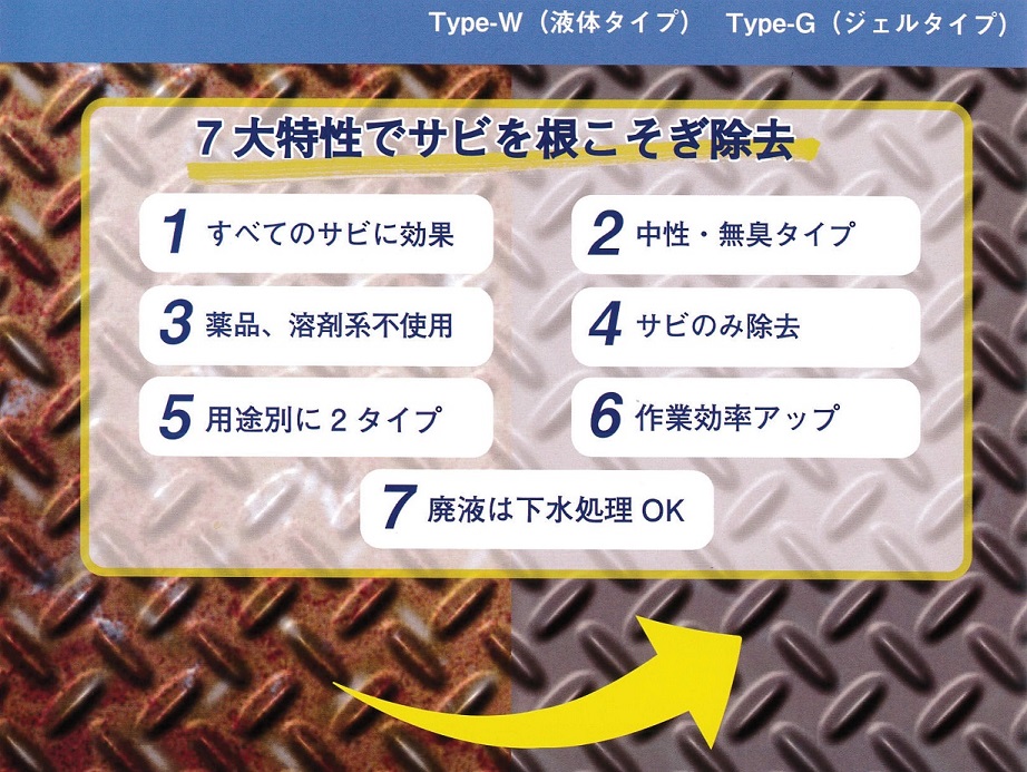 ・用途別に、浸け置きや噴霧用の液体タイプの「Type-W」と、傾斜や基材の状態により流れ落ち易い場所向けにジェルタイプの「Type-G」の2タイプあり、作業性を高めています。