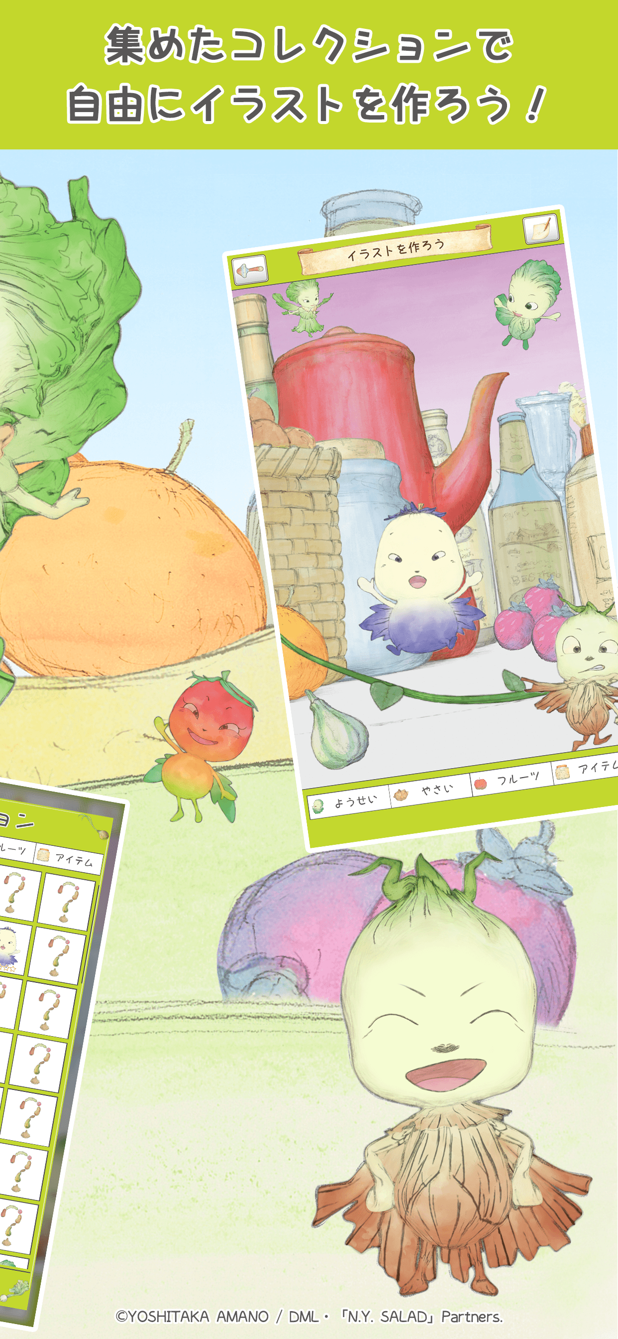 「ファイナルファンタジー」シリーズのビジュアル・コンセプトをデザインしたことで知られる世界的アーティスト・天野喜孝氏の画集「N.Y.SALAD」が原作のアニメ「やさいのようせい」初のゲームアプリ。
