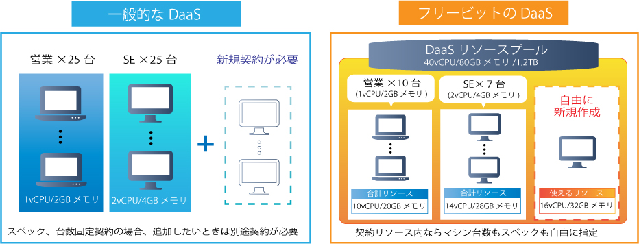 従来の仮想デスクトップサービスの多くが最低デスクトップ数のコミット(50台等)を前提に、vCPU/メモリ/HDDのモデルを何台購入するかを検討するサービス設計となっているのに対し、「freebit cloud X-DaaS」は「リソースプール」というデスクトップ用リソースを提供することで、用途に合わせ好きなスペックのデスクトップモデルを好きな数だけ自由に割り当てることが可能なサービス設計を実現しました。また、デスクトップ構成(スペックや台数)の変更についても、オンプレミスのVDI環境の構築や追加契約の必要なく、フレキシブルかつ迅速に対応することが可能になることで、自然災害やパンデミック等の緊急事態に備えるBCP(Business Continuity Plan)対策としても活用いただくことが出来ます。