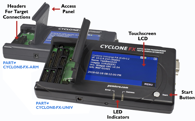 より高速な通信速度、より多くの拡張可能なストレージ、追加のセキュリティオプションなど、人気のあるCyclone LCプログラマにさまざまな拡張機能を提供します。プログラミングは、ホストPCを使用せずにボタンを1回押すか、自動制御SDKを介してPCから自動的に起動できます。Cycloneは、開発中のデバッグプローブとしても使用できます。