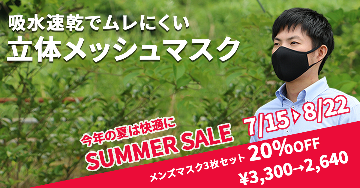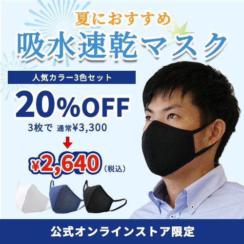 7/15(金)〜8/22(月)までの期間中、夏におすすめの吸水速乾マスクセットがオンラインストア限定で20%OFF!内生地の放湿冷却素材が、積極的に汗を逃がして冷却します。今年こそは夏のマスク生活を快適に過ごしましょう!爽やかに着用できるメンズの人気3色セット・定番の白マスクセット・夏におすすめのネイビーセットからお選び下さい。