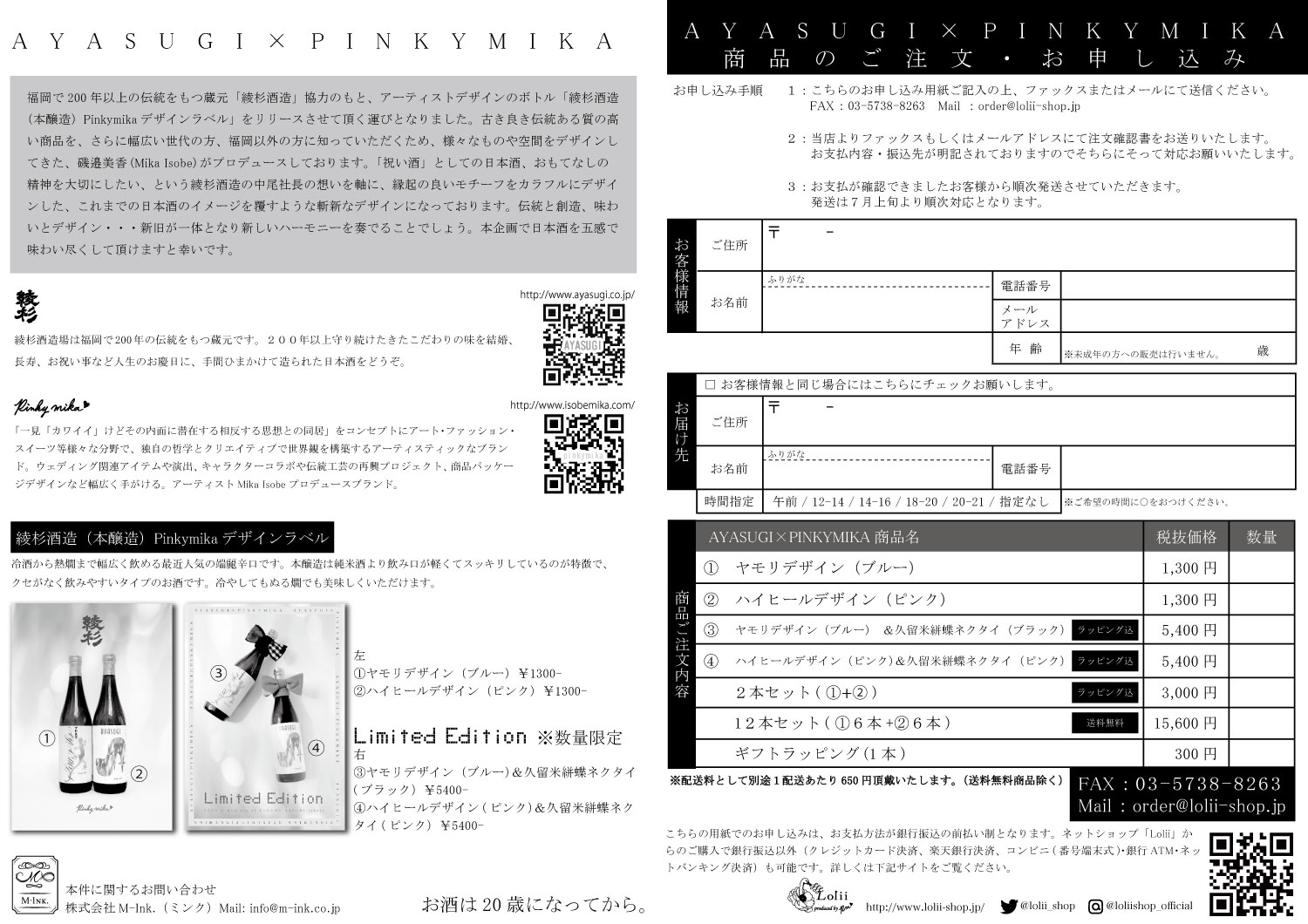 福岡で200年以上の伝統をもつ蔵元「綾杉酒造」協力のもと、アーティストデザインのボトル「綾杉酒造(本醸造)Pinkymikaデザインラベル」をリリースさせて頂く運びとなりました。