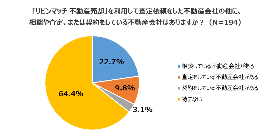 最後に「当サイトを利用して査定依頼をした不動産会社の他に、相談や査定、または契約をしている不動産会社はあるか?」聞いたところ、『特にない』(64.4%)が最多でした。一方『相談をしている不動産会社がある』(22.7%)、『査定をしている不動産会社がある』(9.8%)、『契約をしている不動産会社がある』(3.1%)と事前に他社と何らかのアクションを起こしている人が、35.6%もいることがわかりました。当サイトを利用することで、より良い不動産会社を探しているとも考えられます。