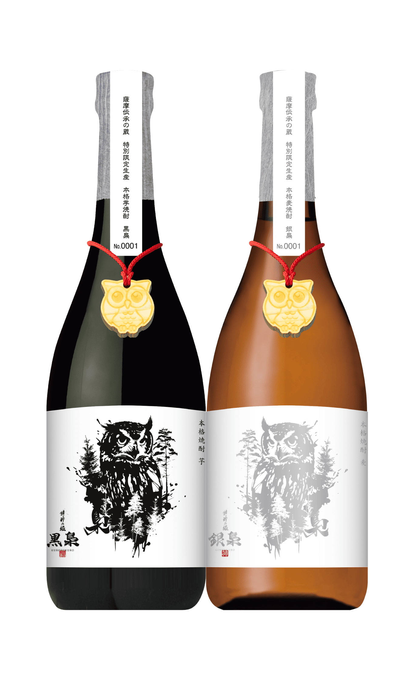 芋焼酎の「黒梟」はフレンチオーク樽で5年の歳月をかけて貯蔵した古酒をブレンド(30%使用)した琥珀色の焼酎に仕上げ、麦焼酎の「銀梟」は9年もの歳月をかけてじっくり熟成をした古酒となっており、ともに玄人もうなる逸品となりました。