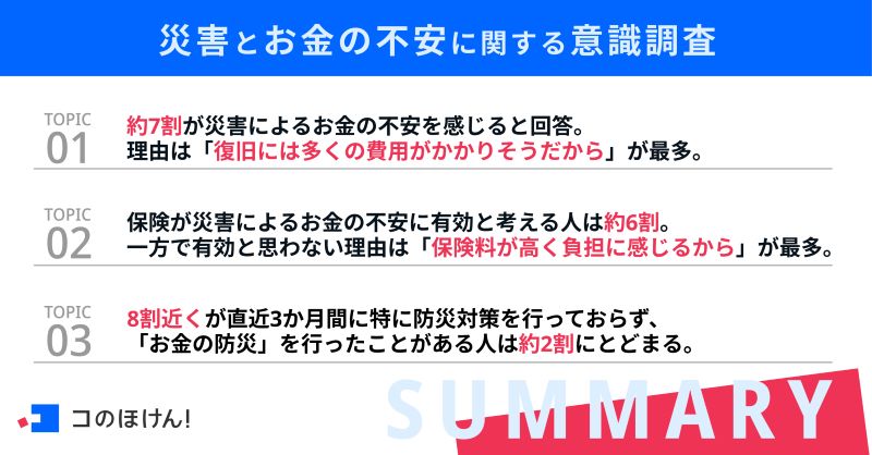 今回の調査では多くの人が災害によるお金の不安を感じていることが明らかになりました。理由として「復旧には多くの費用がかかりそうだから」という回答が多いことから、被災後に必要な出費が予測できないことに対する不安が特に大きいと考えられます。保険がこうした不安に有効だと考える人は半数を超えましたが、保険料の負担を理由に保険が有効だと思わない人も一定数いました。また、直近3か月以内に防災対策を行った人は3割程にとどまり、8月の南海トラフ地震臨時情報や9月の防災の日を経たものの、実際に防災に関連した行動をとったのは少数であったことがわかります。さらに災害による経済的損失に備える「お金の防災」を実施したことがある人は約2割程度となりましたが、これは「お金の防災」の認知度の低さも原因と考えられます。