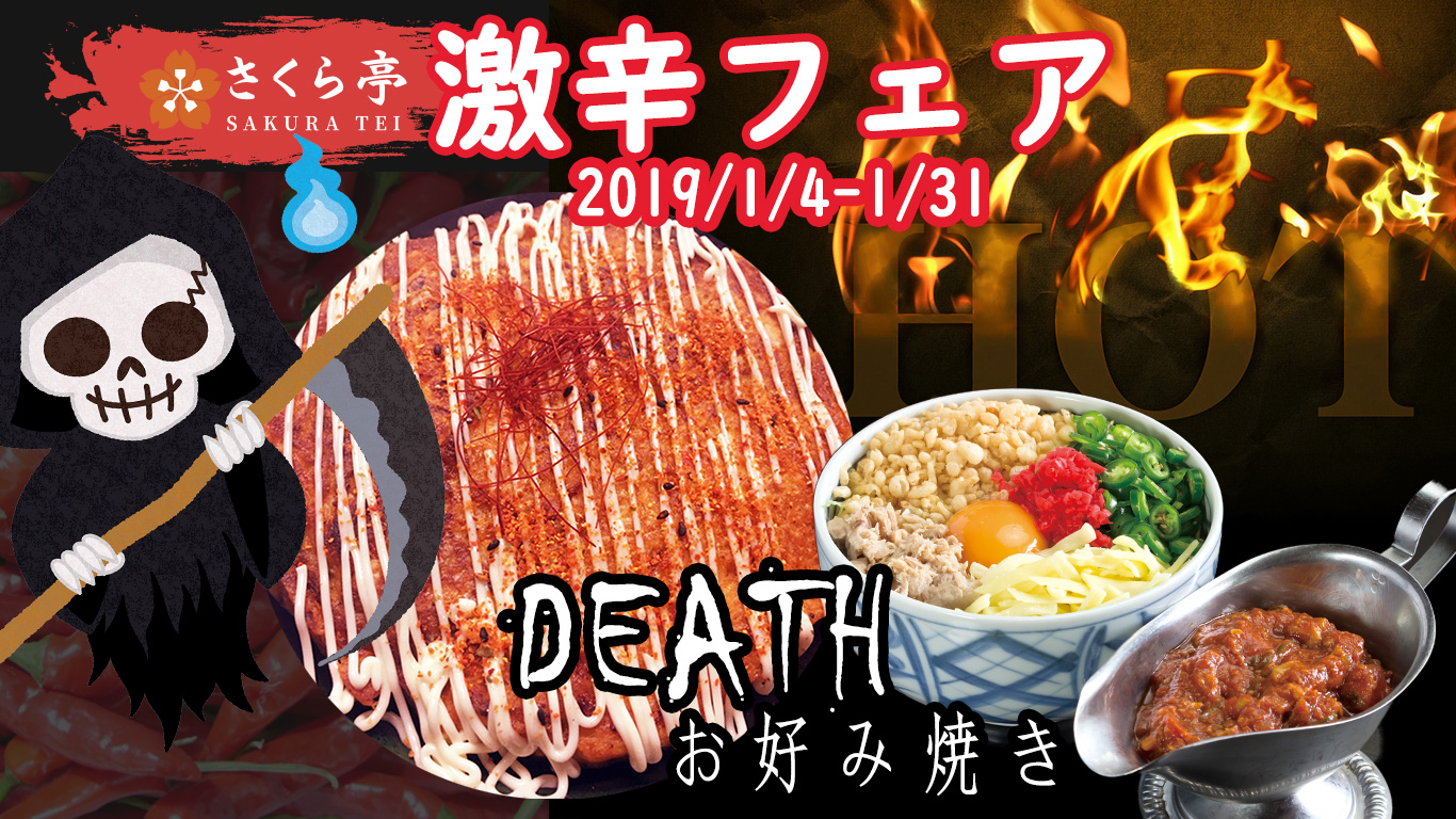 辛く煮込んだ鶏肉入りDeathソース、韓国のタッケジャンからインスピレーション得た辛い出汁をこれでもかと使った、さくら亭渾身の辛旨「DEATHお好み焼き1号、2号」、「激辛もんじゃ1号、2号」、「DEATH焼きそば」、5種類を一気に発売します。