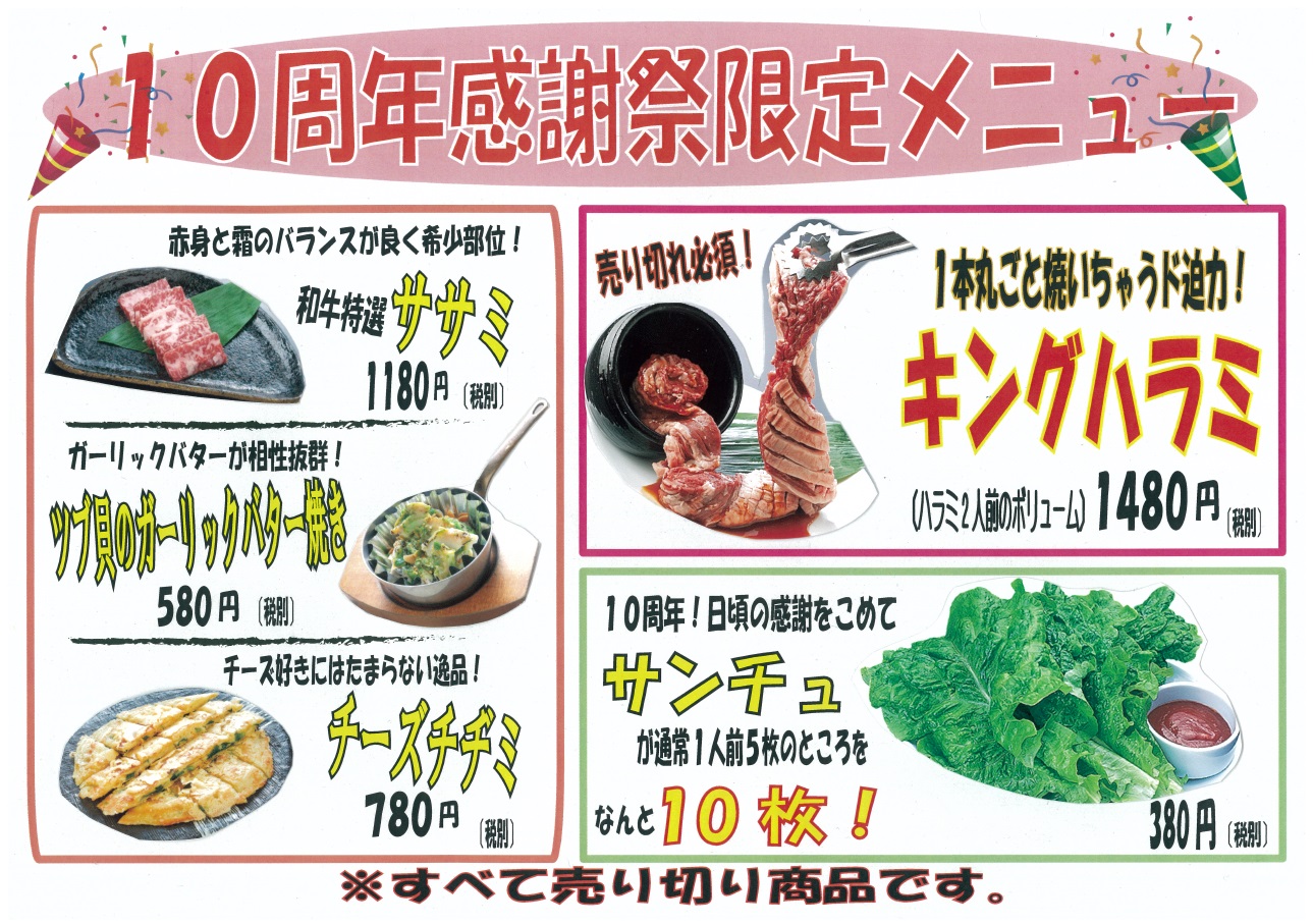 代表取締役:山泉篤) が運営する焼肉屋「熱烈カルビ 本牧店」は、2019 年5 月15 日( 水) に10 周年を迎えました。