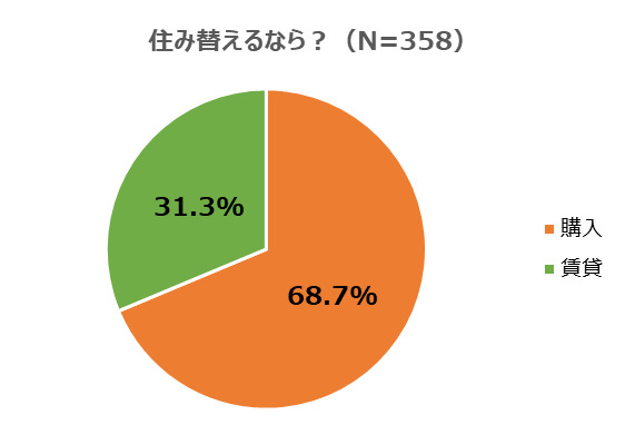 つづいて「もし住み替えるなら、また購入するか?それとも賃貸にするか?」を聞いたところ、『購入』(68.7%)、『賃貸』(31.3%)となりました。