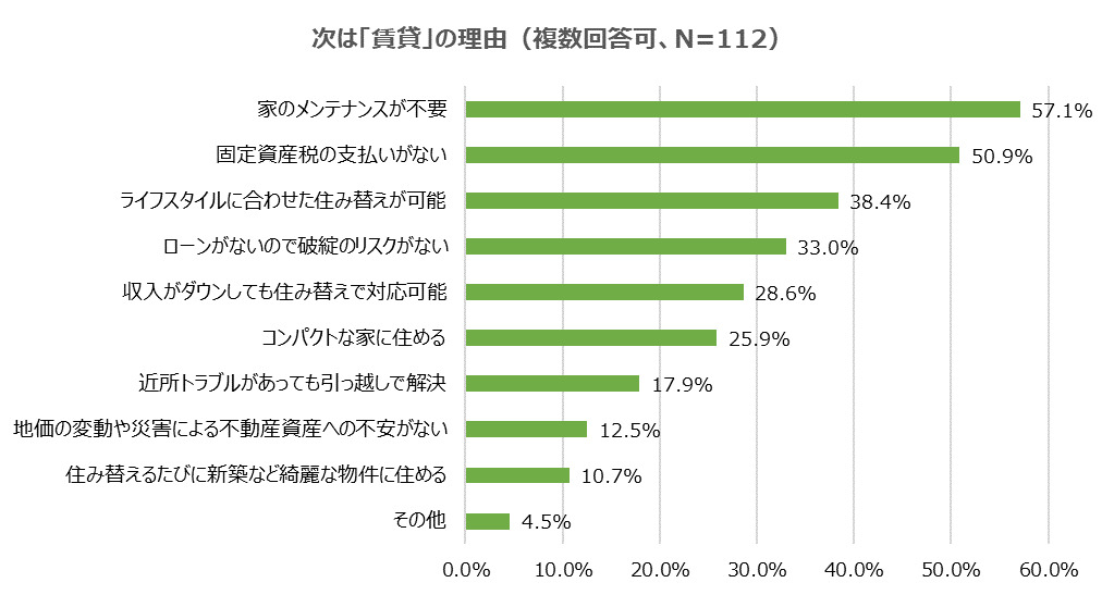 つぎに「賃貸」と回答した人にもその理由を聞きました。『家のメンテナンスが不要』(57.1%)、『固定資産税の支払いがない』(50.9%)が半数以上占め、『ライフスタイルに合わせた住み替えが可能』(38.4%)、『ローンがないので破綻リスクがない』(33.0%)、『収入がダウンしても住み替えで対応可能』(28.6%)、『コンパクトな家に住める』(25.9%)、『近所トラブルがあっても引越しで解決』(17.9%)、『地価の変動や災害による不動産価値への不安がない』(12.5%)、『住み替えるたびに新築など綺麗な物件に住める』(10.7%)となり、『その他』(4.5%)には「財産を残したくない」「高齢なのでローンが組めない」「購入したものは収益物件で、自宅は賃貸」などがありました。