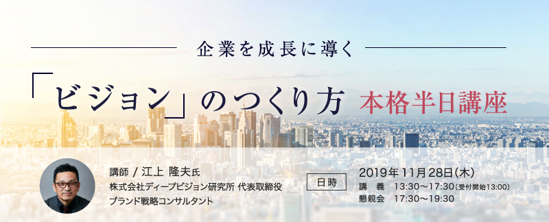 「企業の未来を指し示すコンパス」「カネで買えないが、いちばんカネになるもの」それが” ビジョン ”です。しかし、ビジョンが重要なことは分かっているが、正しいビジョンとは何なのか?、どのようにつくればいいのか?、そもそもなぜビジョンが重要なのか?、ビジョンはあるが形だけのものになってしまっている状況を変えたい、と課題を抱えている経営者、幹部の方が多いのも事実です。そこで、『THE VISION あの企業が世界で成長を遂げる理由』(朝日新聞出版)ほか、ロングセラー『無印良品の「あれ」は決して安くないのになぜ飛ぶように売れるのか』(SBクリエイティブ)などを著書に持つ、ブランド戦略コンサルタントの江上隆夫氏を講師に迎えた半日講座を開催します。優れたビジョンはどのようにつくればいいのか、成長につながるビジョンのつくり方について解説を交えながら、ビジョンづくりワークにもじっくりと取り組んでいただけるプログラムや、講義後には、江上氏を交えて、情報交換やネットワーク構築いただける懇親会も予定しています。
