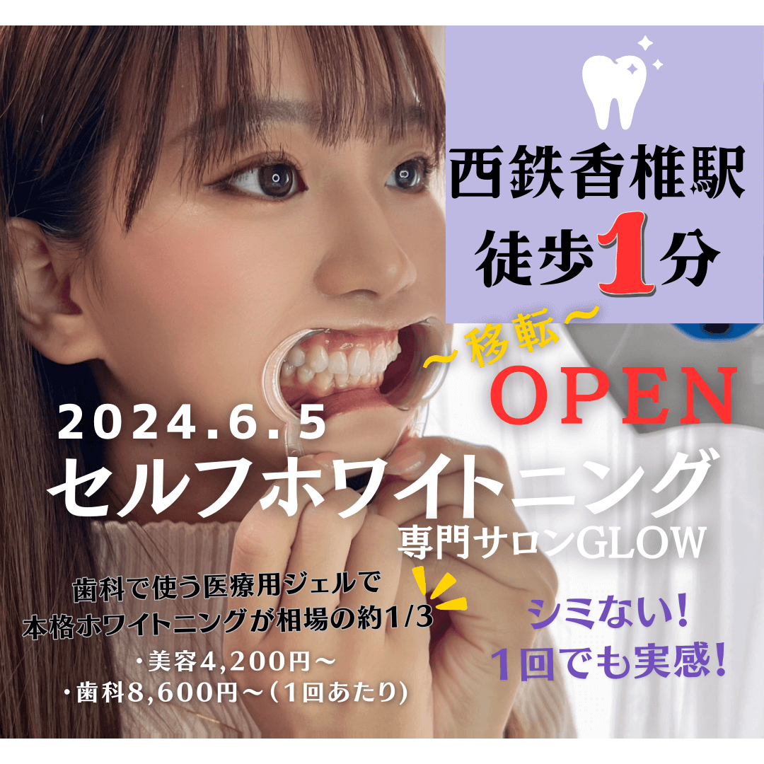 メンズ率急増中!東区No,1白くできるセルフホワイトニング専門のサロン☆東区香椎で歯のセルフホワイトニングなら専門店GLOWへ!美容・歯科選べる2つのメニュー!歯科ホワイトニングは相場の約1/3&周りを気にせずホワイトニング!シミない材料を採用しています!