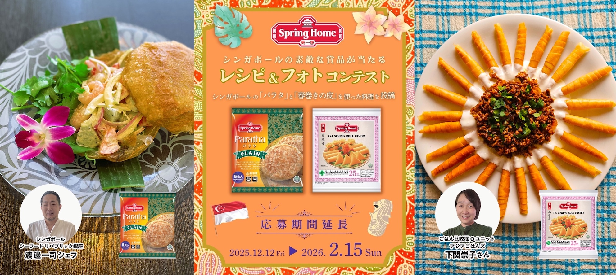 シンガポールの人気食品を製造販売し、欧米やアジア、中東など世界80カ国・地域に輸出しているTee Yih Jia Food Manufacturing Pte Ltd(5 Senoko Road, Tee Yih Jia Food Hub, Singapore)は、シンガポール建国60周年を記念して、日本国内で販売中の2商品(パラタ、春巻きの皮)を使ったInstagramキャンペーン「シンガポール[Spring Home]レシピ&フォトコンテスト」を2025年12月12日(金)から開催中です。お客様からの応募が続々と増えていることを受けて、このたび応募期間を2週間延長し、2026年2月15日(日)まで開催することに決定しました。