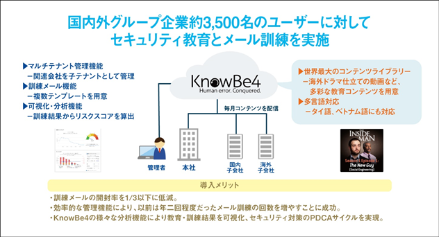 KnowBe4は、海外ドラマ仕立てのコンテンツをはじめ、多彩な教育コンテンツが大量に用意されており、また、メール訓練や訓練結果の可視化・分析機能も備えているので、教育・訓練・分析の各プロセスを、単一のプラットフォーム上で実行することができます。また、BBSはタイとベトナムに海外現地法人がありますが、KnowBe4は多言語対応でタイ語、ベトナム語にも対応していることから、これらの海外拠点にも教育や訓練を展開することができます。