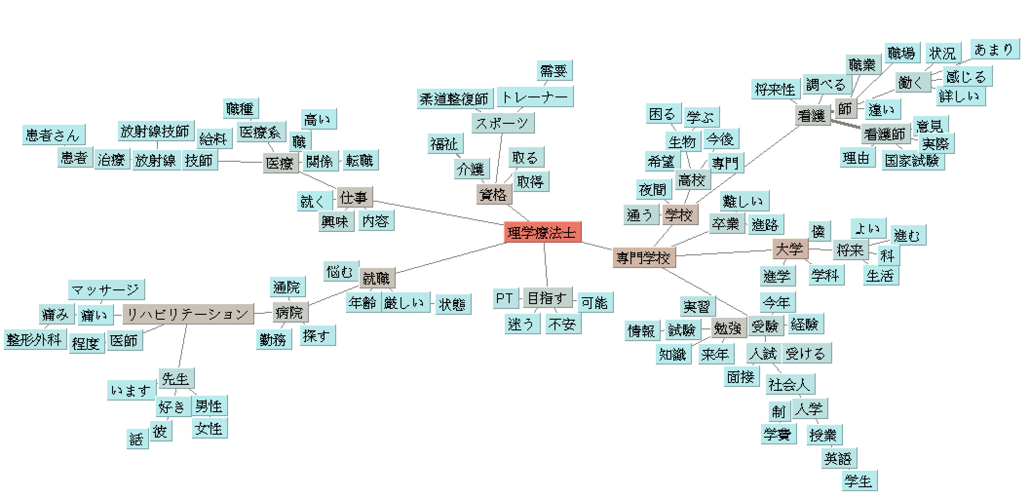 質問内容については、『理学療法士』に紐付いて頻出するワードを抽出したキーワードマップをもとに大別すると、「仕事」「資格」「学校」といったワードの頻出頻度がとくに多いことからそれらを総じて【進路】、その他には「好き」「彼」といったワードから想起される【患者と理学療法士との人間関係】に分けられました。