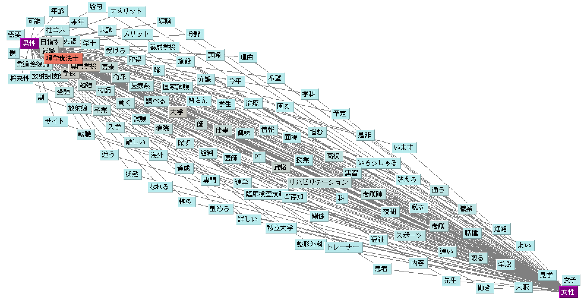 【進路】に関しては、理学療法士になるために学べる大学や専門学校などの検討や、他の医療関連の職種との比較など、理学療法士になるための質問が多く寄せられました。これらの男女での差異を分析すると、理学療法士との職種の比較として、男性は大学学部の専攻選択先として放射線技師、臨床検査技師、転職先として柔道整復師をあげており、女性は看護師、トレーナー(スポーツトレーナー、アスレティックトレーナーなど)を比較対象としていました。また、理学療法士の職業検討にあたっては、女性よりも男性の方が給与、将来性や需要、学校選択のメリット/デメリット、年齢を気にしている傾向が見られました。
