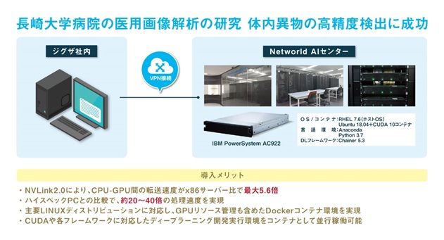 ITインフラのソリューション・ディストリビューターである株式会社ネットワールド(本社:東京都千代田区、代表取締役社長 森田 晶一)は、検証施設「PIC(Pre Integration Center)」内に常設している「Networld AIセンター」の「IBM PowerSystem AC922」(以下 PowerSystem AC922)を解析処理インフラとして、パートナーであるジグザ株式会社(本社:東京都千代田区、代表取締役 櫛田 和洋)が、AIによる医用画像解析の研究を長崎大学病院と共同で実施し、実用化に向けて大きな成果が得られたことを発表します。
