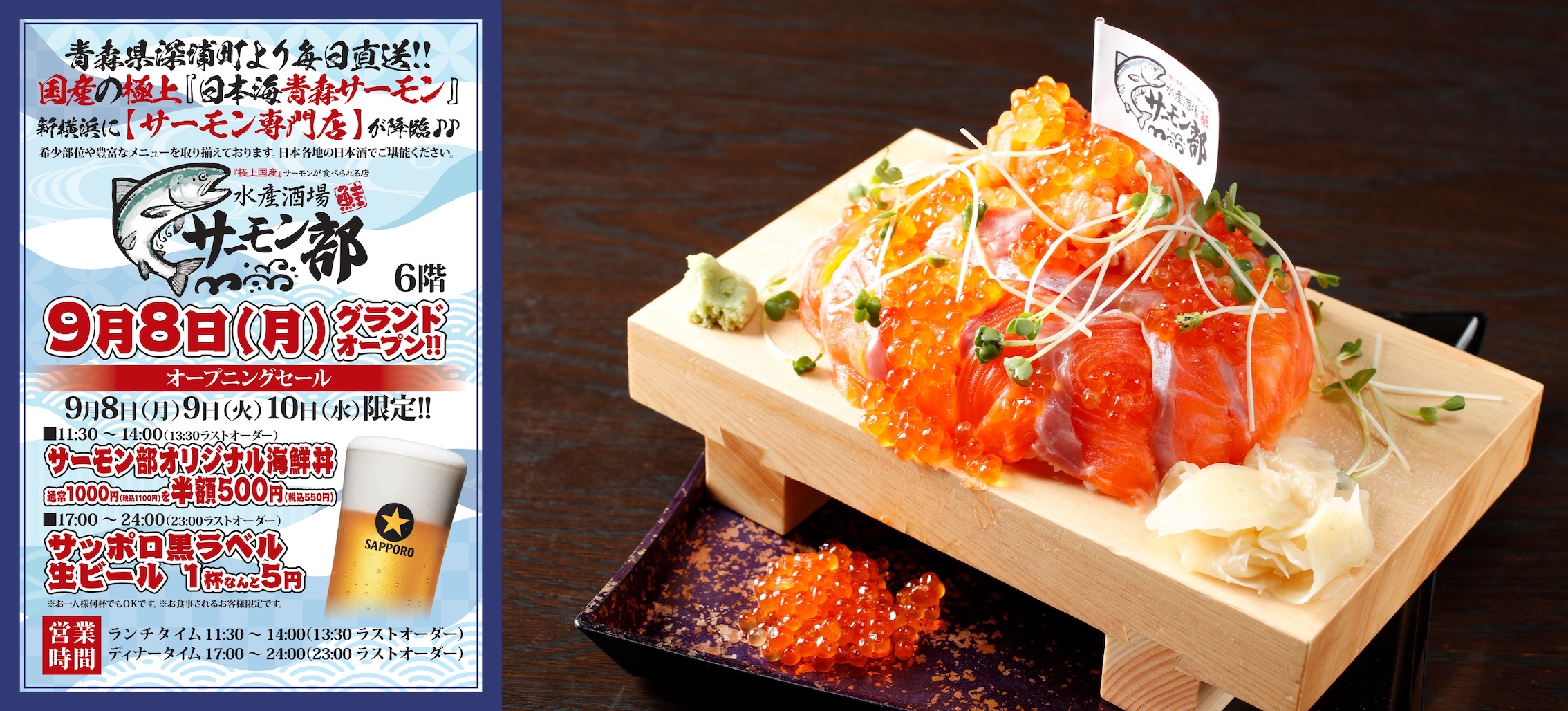 オープニングセールとして9月8日(月)~10日(水)の3日間、ランチでは「サーモン部オリジナル海鮮丼」550円(税込)を提供し、ディナーでは「サッポロ黒ラベル生ビール」をなんと1杯5円(税抜、2杯注文の場合は税込11円)で提供します。ぜひこの機会にお得にお楽しみください。