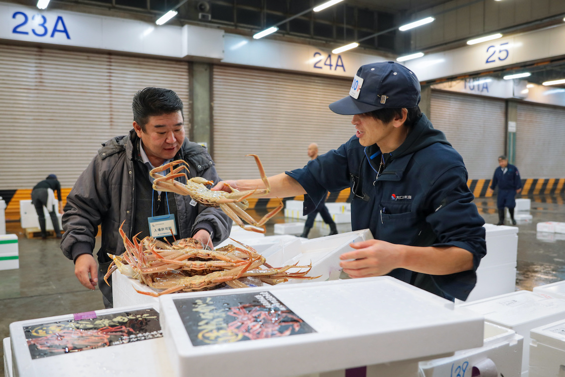 ▲甲羅本店の職人が現地で活ガニを厳選