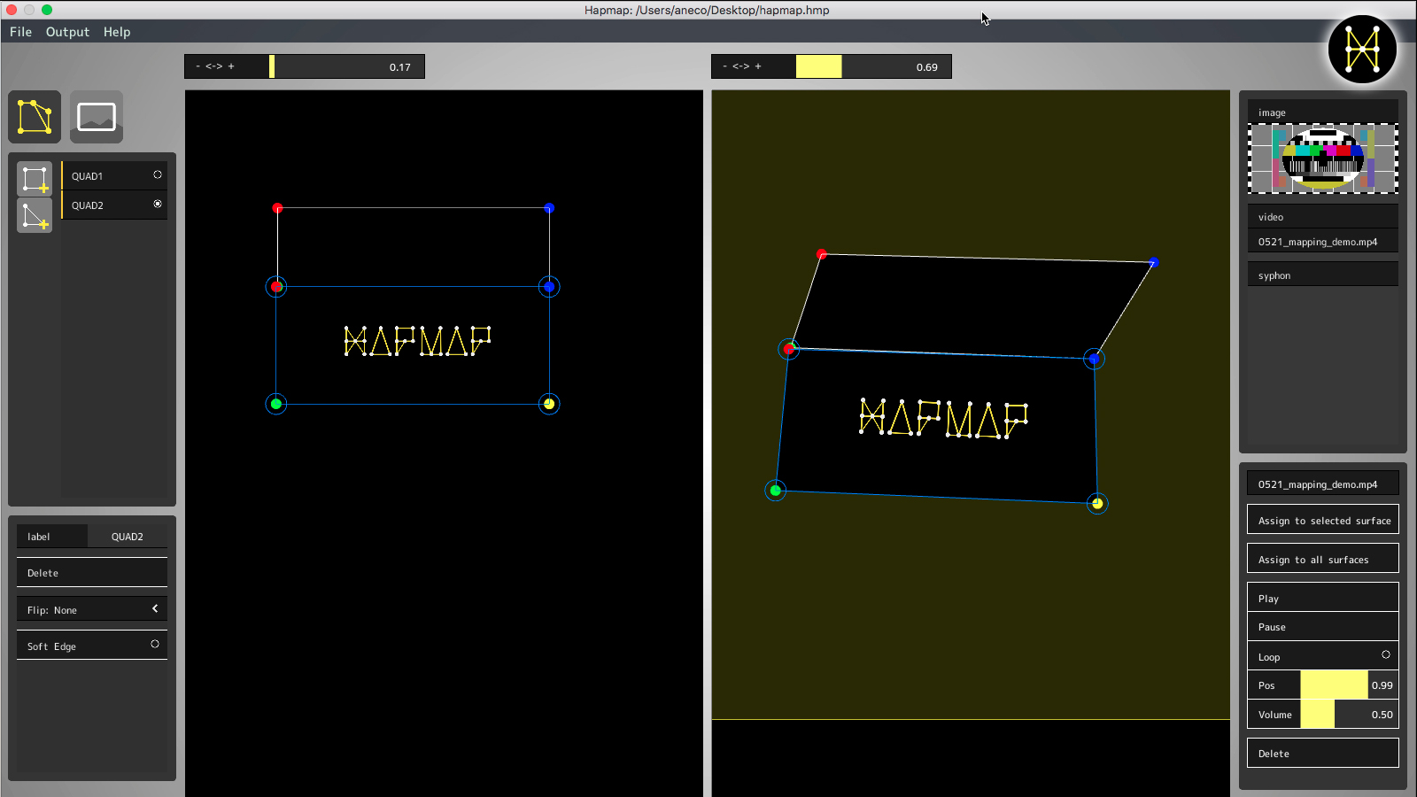 プロジェクションマッピングは近年、広告やアート作品、アトラクションなどのエンターテインメントを含め幅広い用途で活用されています。そんな中、使われているプロジェクションマッピングの投影補正ソフトウェアは、非常に多くの機能を備えたハイエンドなツールが大半であり、実際に使用する機能は僅かであるにも関わらず、高い導入コストを払わなければならないという問題がありました。Hapmapは、機能を最低限に絞ることにより、導入コストを抑え、より多くの人に、手軽にプロジェクションマッピングを楽しんでもらうことを目的に開発されました。